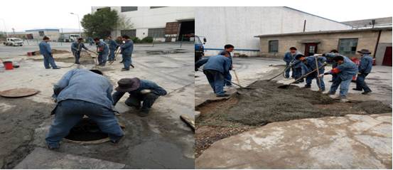 時(shí)至夏日,天氣多變。臨時(shí)土建維修隊(duì)充分發(fā)揮車(chē)間人員中懂得土建施工技能的優(yōu)勢(shì),悉心謀劃,從職工家中借用攪拌機(jī)等施工機(jī)械,加班加點(diǎn)有序進(jìn)行著屋面防水修復(fù)、路面地基處理、排水溝的修復(fù)等維修工作。在公司車(chē)隊(duì)密切配合下,截至6月4日共修復(fù)屋面防水358平方米,路面維修290平方米、路基整修87立方米,排水溝修復(fù)15米,生產(chǎn)廠(chǎng)區(qū)道路破裂,瀝青澆灌等各項(xiàng)工作。