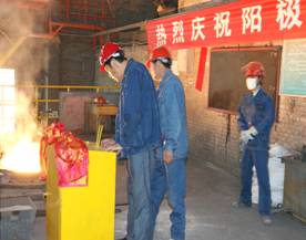 2012年7月7日上午11點零19分,青海物產(chǎn)工業(yè)投資有限公司10萬噸電解鋁/年升級改造項目,簡易陽極組裝車間大門前鞭炮齊鳴。青海物產(chǎn)工業(yè)投資有限公司黨總支副書記、青海長春炭素有限公司總經(jīng)理王松華,公司常務(wù)副總經(jīng)理、項目副總指揮常海寧,工業(yè)投資和長春炭素公司副總經(jīng)理姜紅萍,公司副總經(jīng)理張秉瑜,總經(jīng)理助理范登福等公司領(lǐng)導(dǎo)和各車間、部室的職工出席了簡單的點火澆鑄儀式。王松華同志按下了點火按鈕鄭重宣布澆鑄正式開始。當(dāng)中頻爐工將第一爐鐵水倒入抬包時,標(biāo)志著新陽極組裝車間正式投產(chǎn)運(yùn)行。